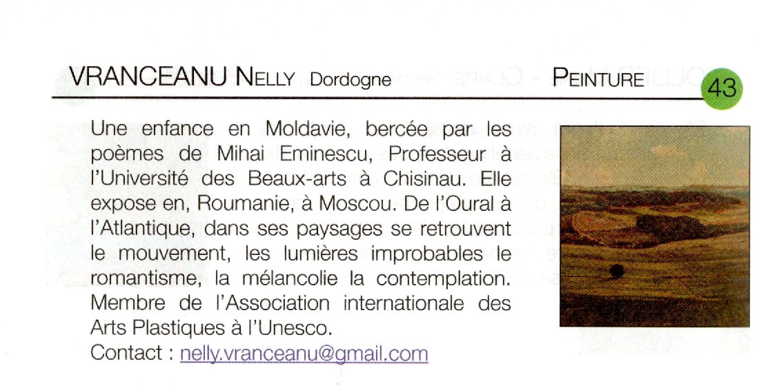 Présente dans le catalogue du 80e Salon Biennal des Beaux-Arts du Périgord (2011), Nelly Vranceanu y expose son travail au sein d’un événement artistique reconnu. Cette participation souligne la visibilité de son œuvre dans des manifestations culturelles majeures et confirme son inscription dans le paysage artistique contemporain.
