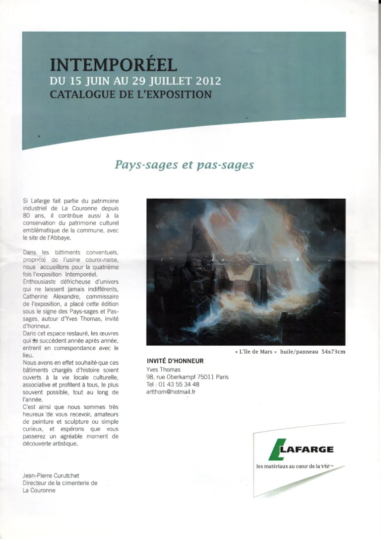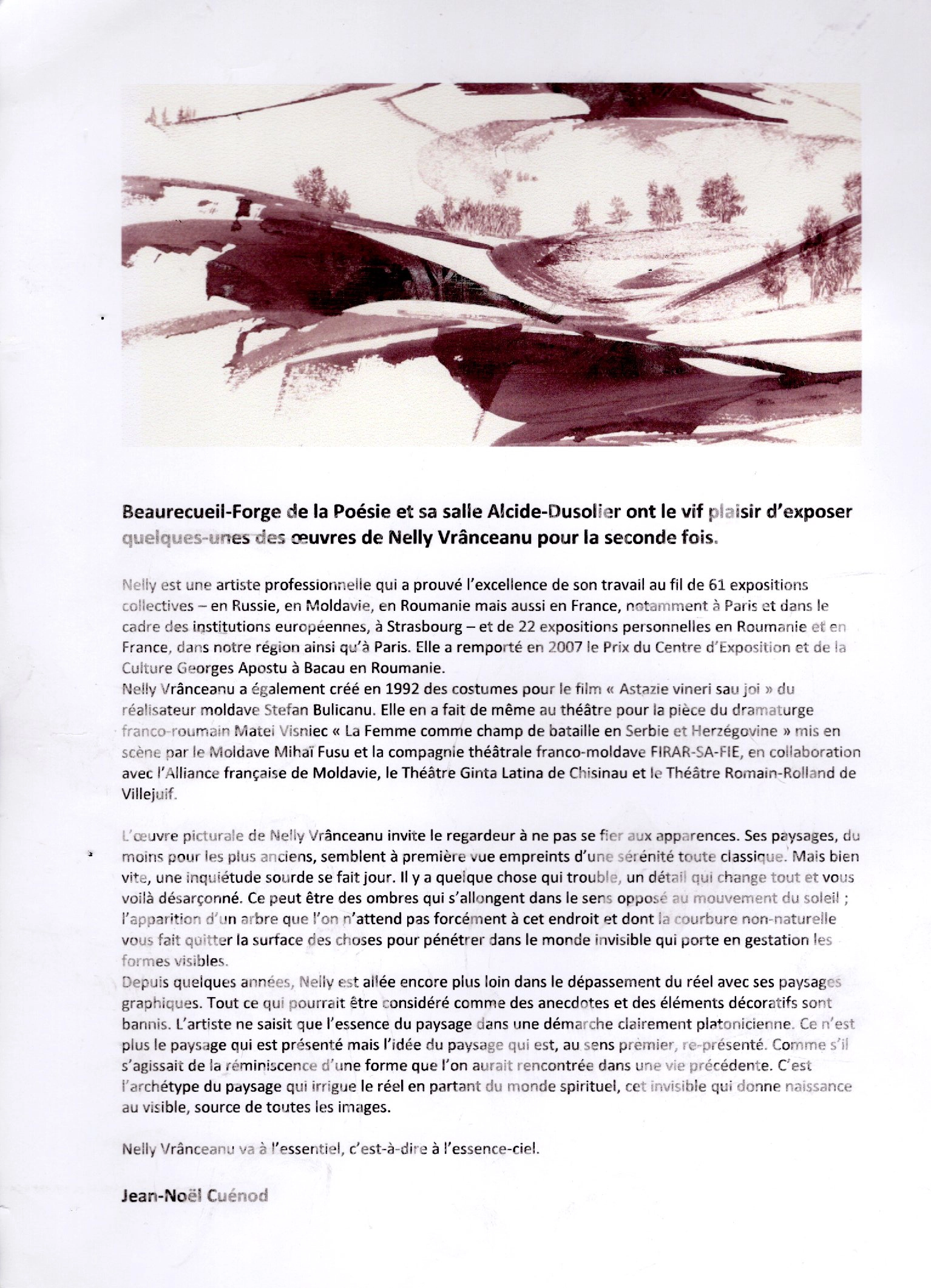 Nelly Vranceanu a participé à l’exposition « Intemporel » en 2012, une manifestation artistique autour du thème « Pays-sages et pas-sages », explorant différentes visions du paysage. Cet événement met en lumière son travail au sein d’un dialogue artistique entre patrimoine, nature et interprétation contemporaine.