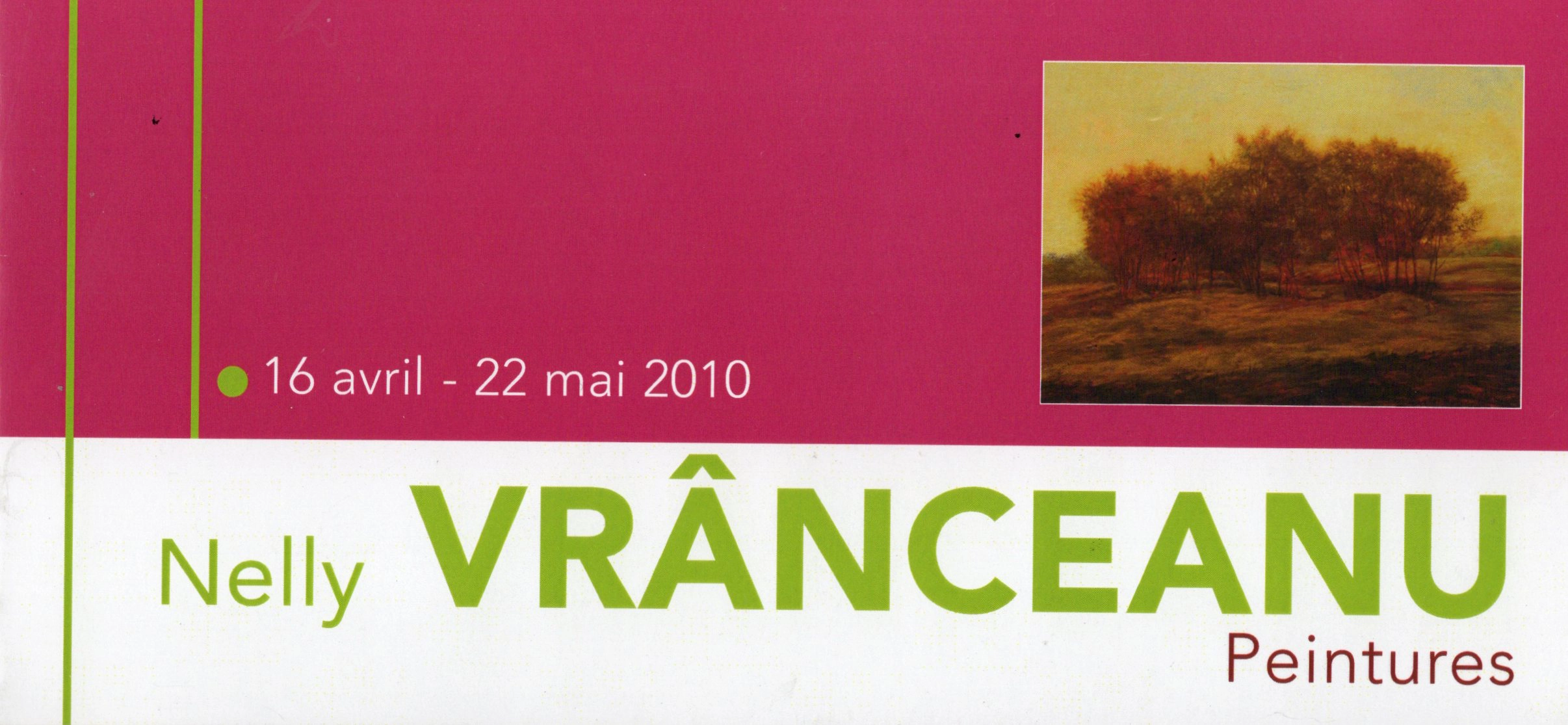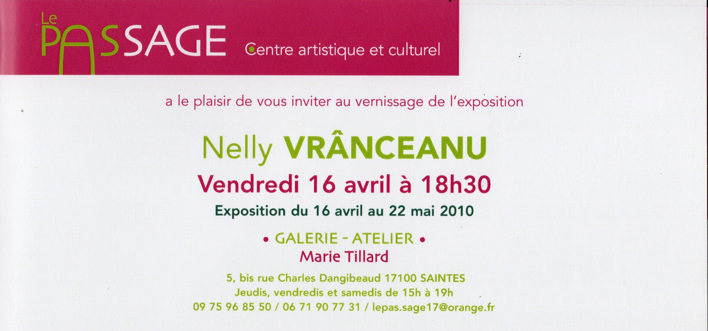 Une exposition personnelle de Nelly Vranceanu s’est tenue au centre artistique Le Passage à Saintes, du 16 avril au 22 mai 2010. Cet événement met en lumière son univers pictural à travers une présentation dédiée, affirmant la singularité de son travail et son ancrage dans la scène artistique contemporaine.