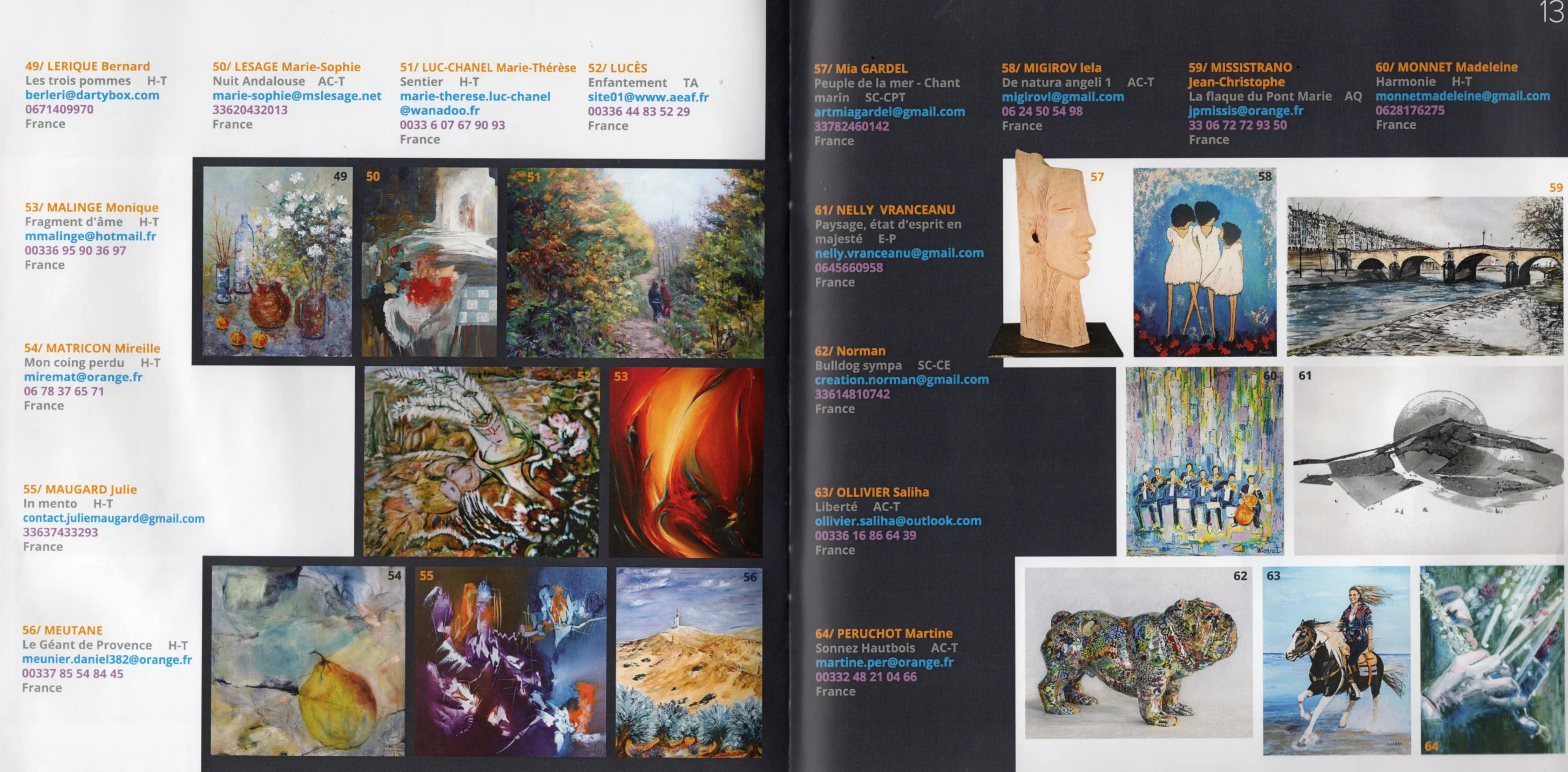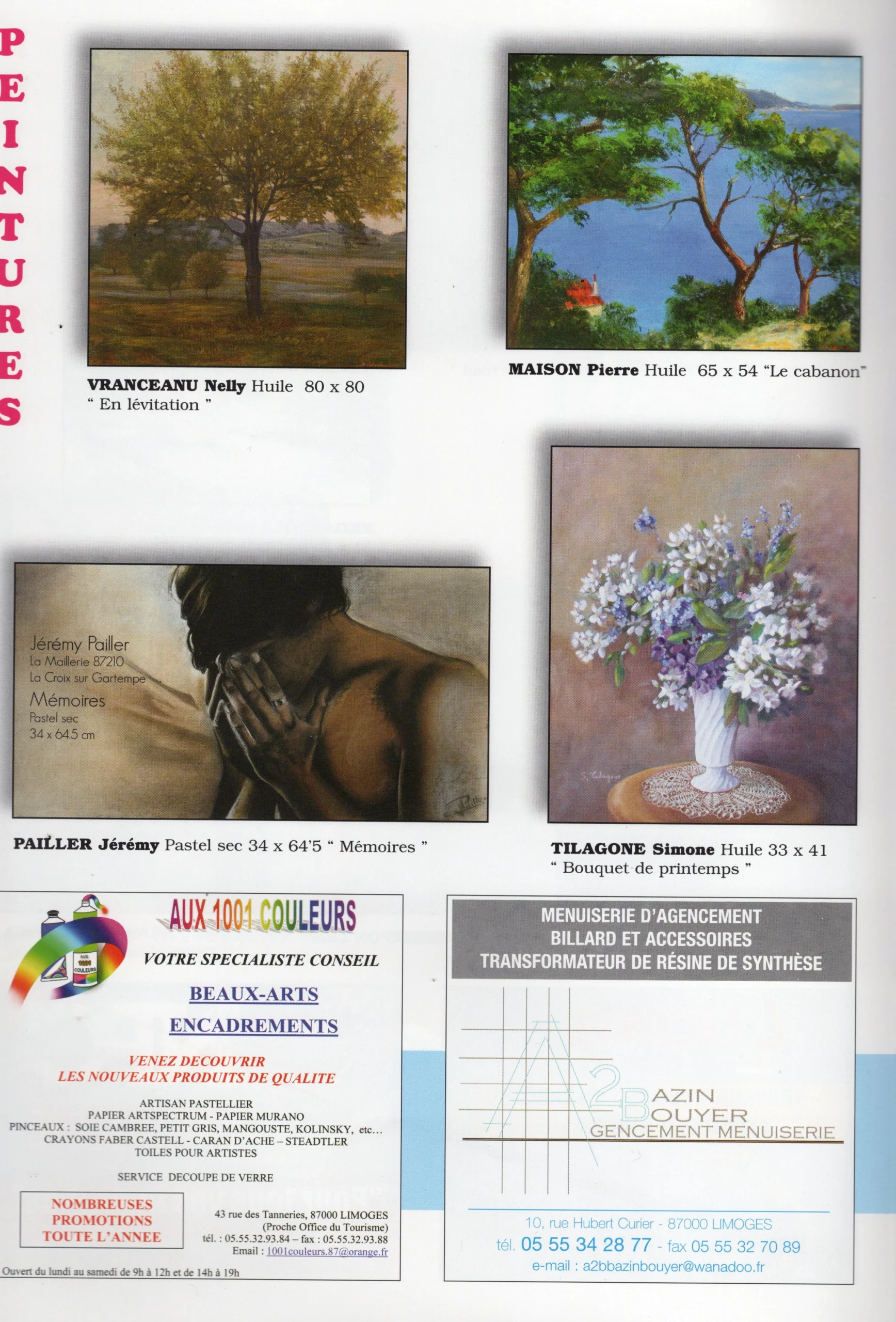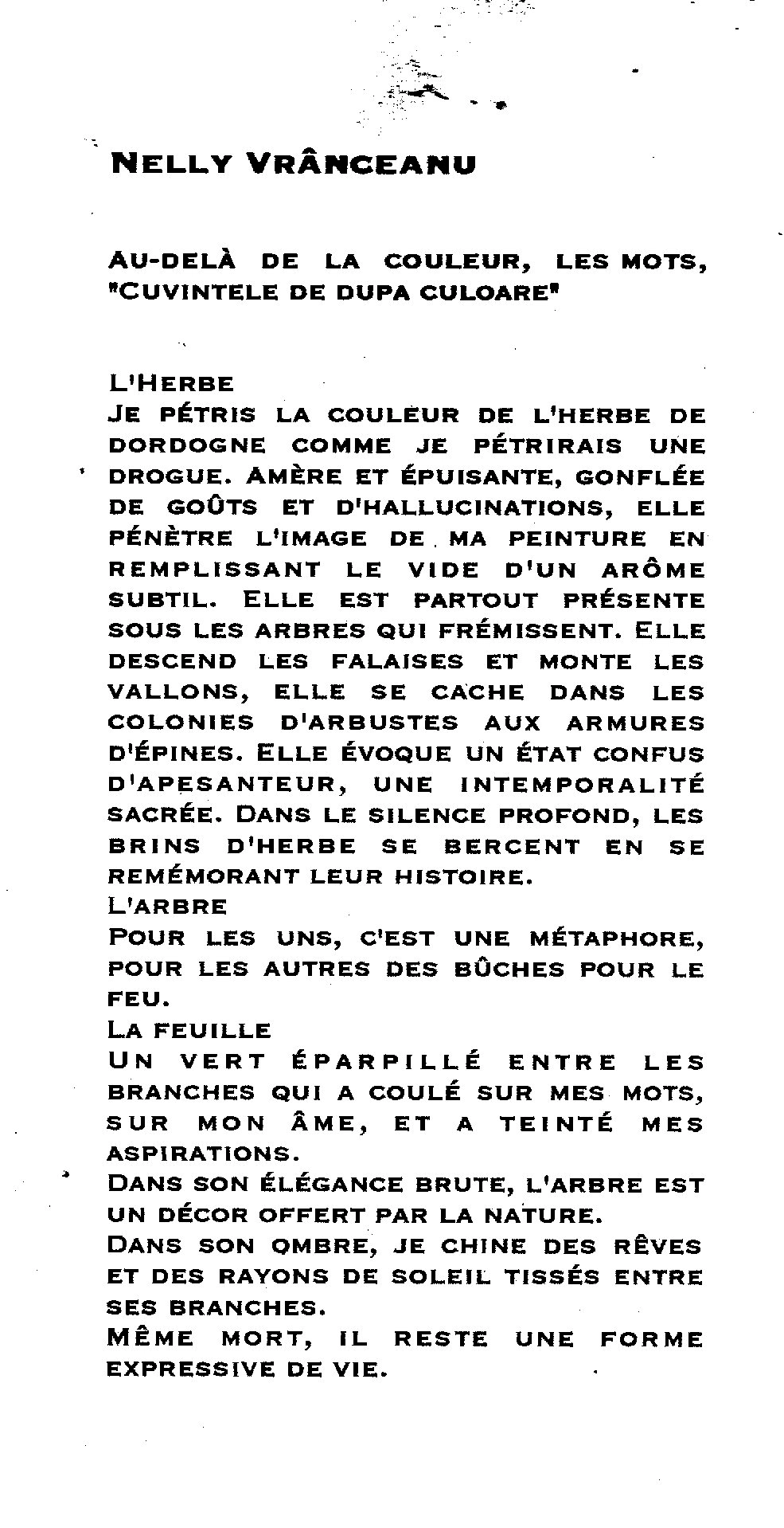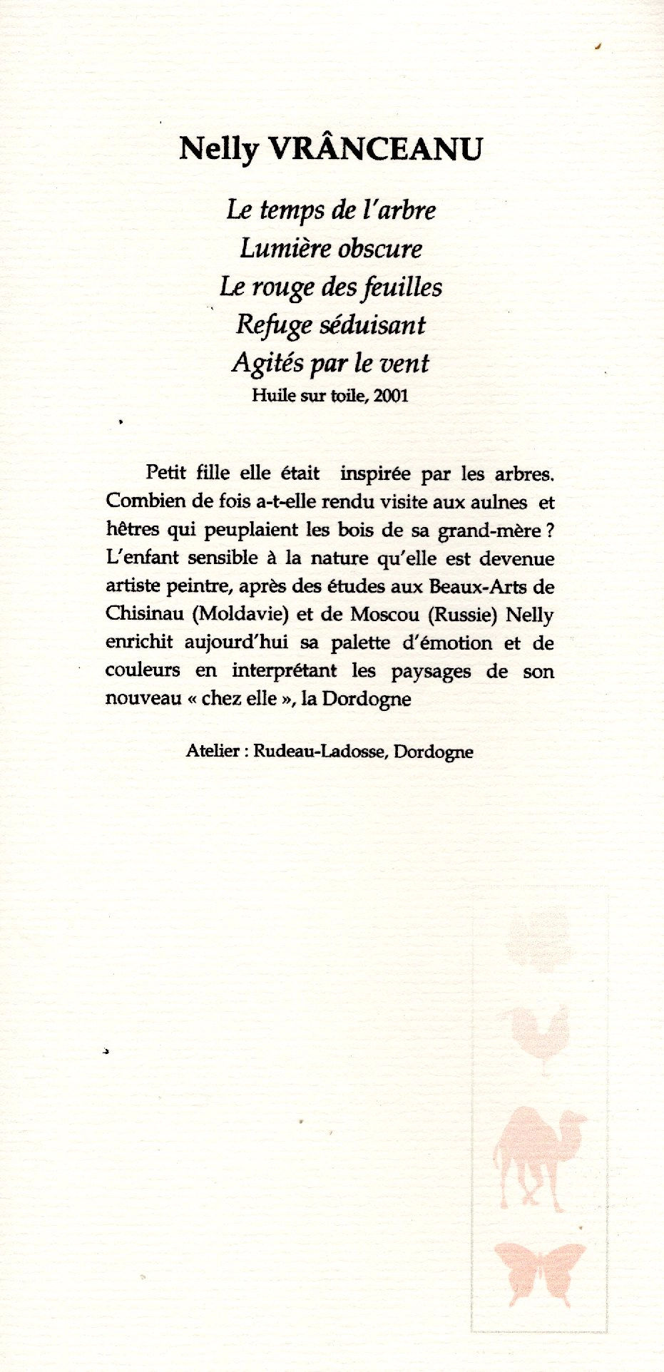 Présentés dans différents catalogues et publications artistiques, ces extraits témoignent de la présence de Nelly Vranceanu au sein de la scène artistique contemporaine. Ils mettent en lumière son travail à travers des expositions collectives et événements culturels, révélant la richesse de son parcours et la reconnaissance progressive de son univers pictural.