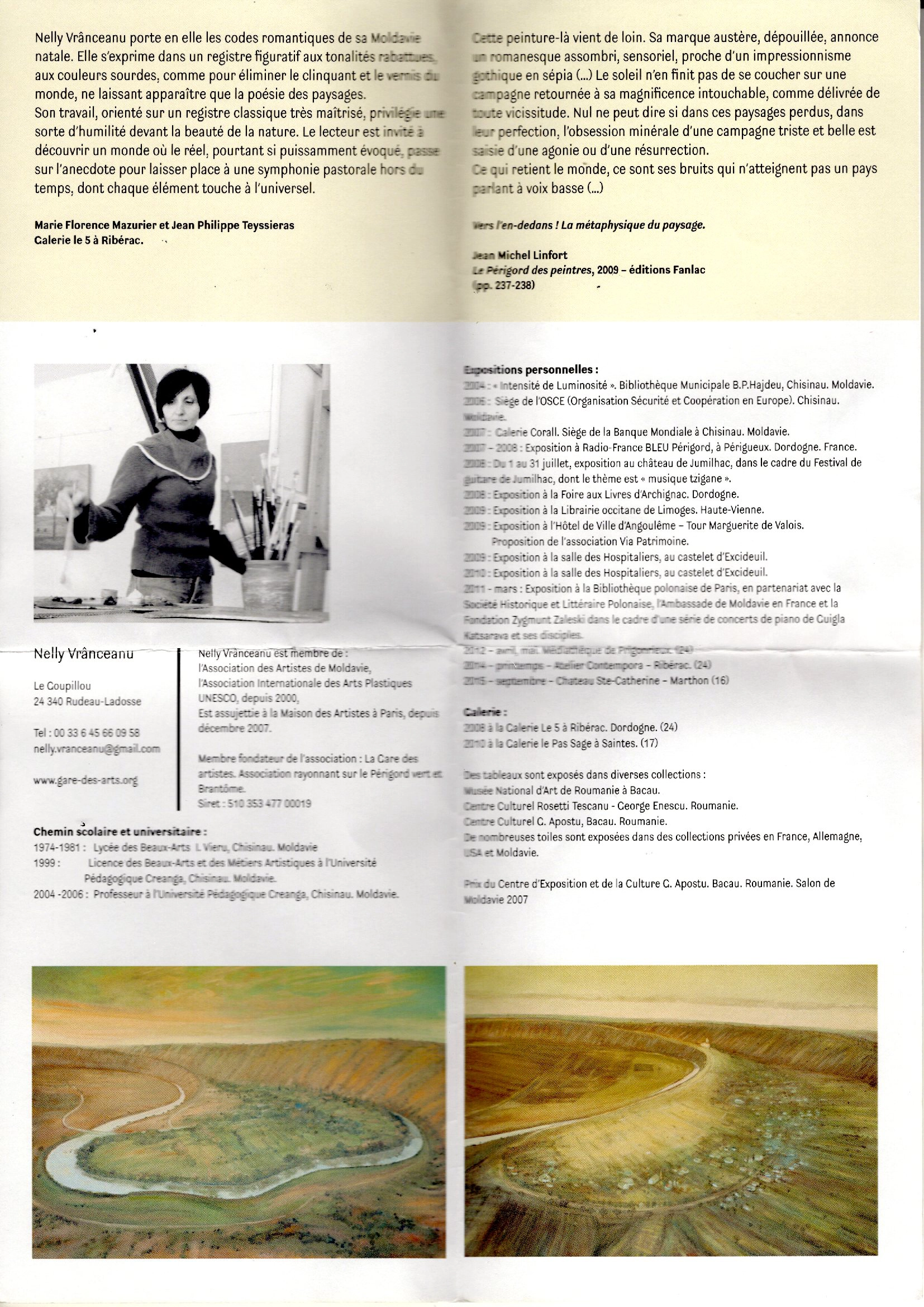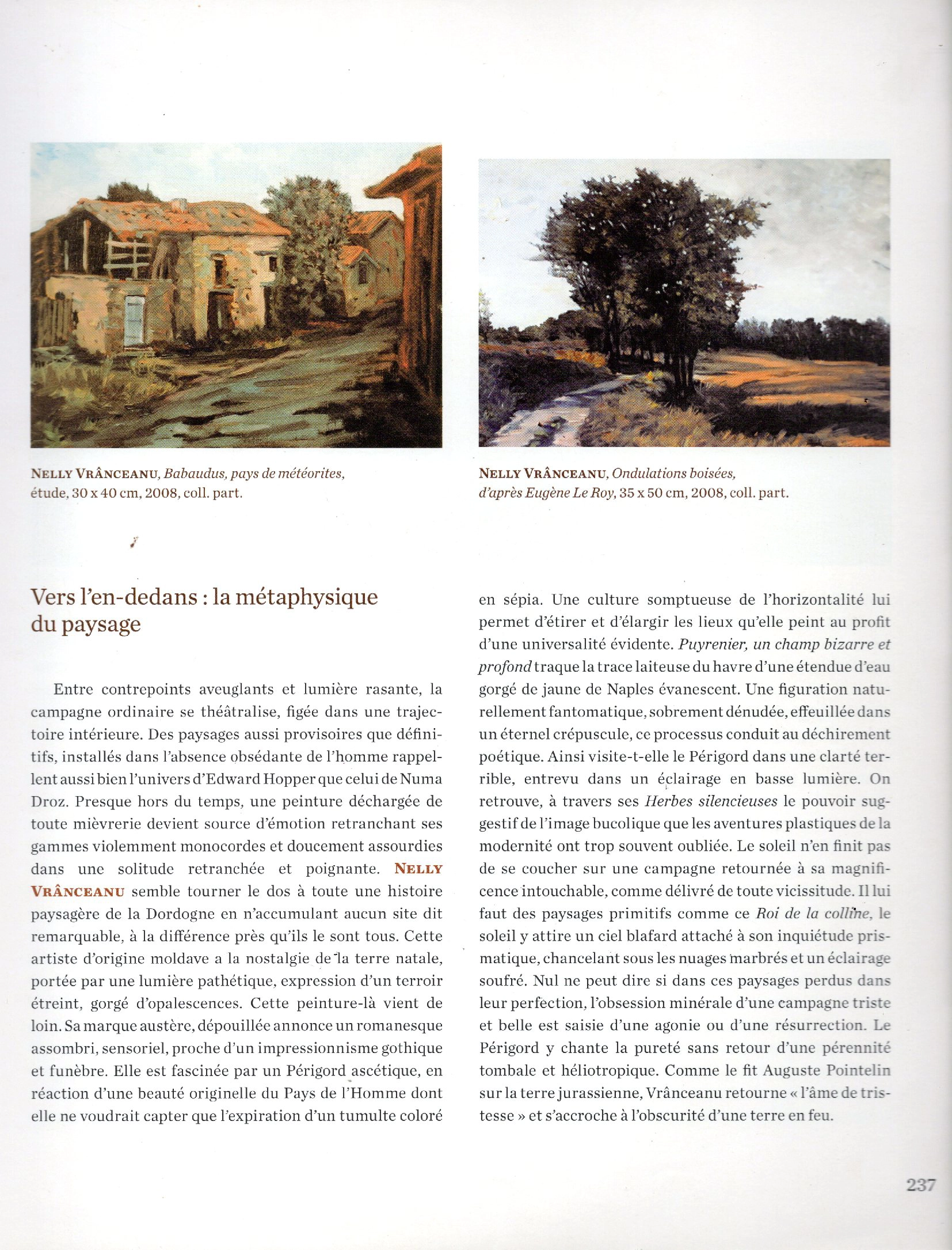 Le travail de Nelly Vranceanu est également référencé dans l’ouvrage « Le Périgord des peintres » de Jean-Michel Linfort (éditions Fanlac), qui met en lumière des artistes ayant marqué le territoire. Cette publication souligne la dimension singulière de son approche du paysage, reconnue pour sa profondeur sensible et sa portée artistique.