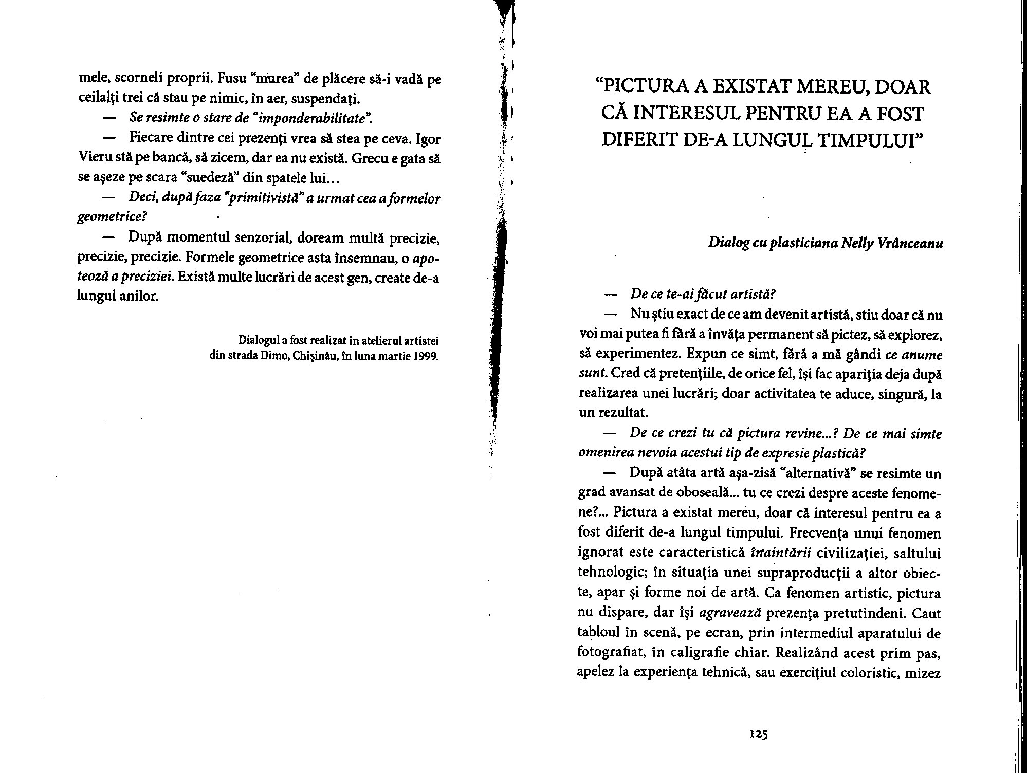 La présence de Nelly Vranceanu dans l’ouvrage roumain Ochiul de veghe, consacré à l’art contemporain basarabe, confirme la reconnaissance de son travail à l’international. À travers cet échange, l’artiste peintre dévoile une approche instinctive et sensible de la création, où la peinture devient un véritable langage émotionnel.