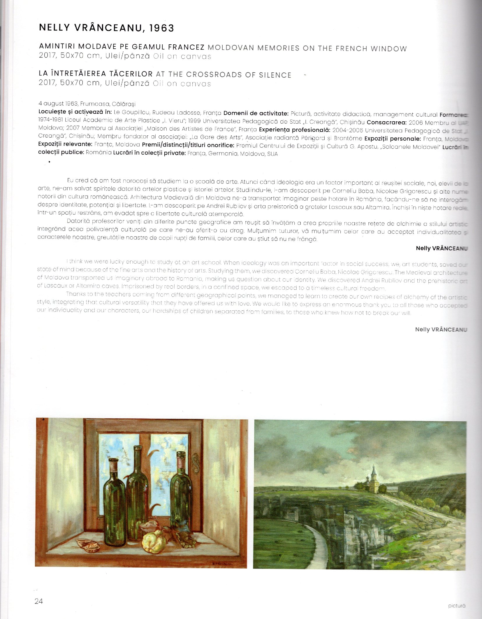 La présence de Nelly Vranceanu dans l’ouvrage Timp fără timp, consacré à l’art contemporain, confirme la reconnaissance de son travail sur la scène artistique internationale. Cet ouvrage met en lumière son parcours et sa démarche, entre exigence artistique et sensibilité picturale.Aujourd’hui installée à Bordeaux, après plusieurs années en Dordogne, Nelly Vranceanu développe une peinture contemporaine du paysage, où lumière, mémoire et émotion se rencontrent.
